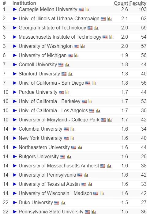 在这份榜单上,卡耐基梅隆大学一如既往地位居榜首,更不用说它是计算机科学的“神学院”了。 第二名是伊利诺伊大学厄巴纳香槟分校, 这所学校的计算机科学专业一直是计算机科学领域的强校; 并列第三的是佐治亚理工学院、麻省理工学院和华盛顿大学。