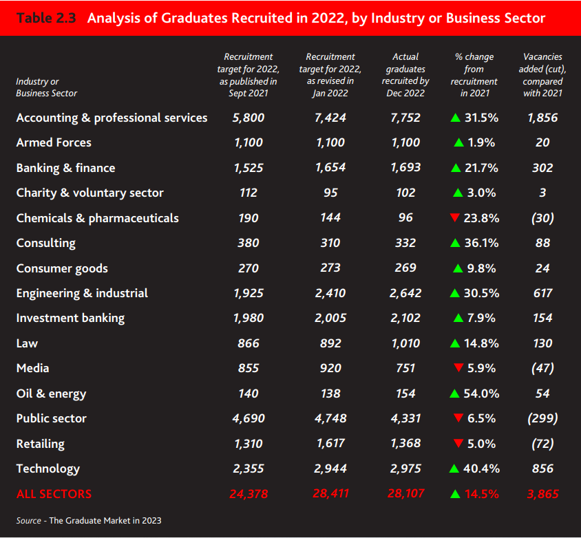 自2022/23招聘周期开始以来,11个关键行业和商业部门的招聘人数都有所增加,最显著的是 会计事务所、科技公司以及工程工业公司 ,相关 理工科、商科专业 的人才需求非常多。