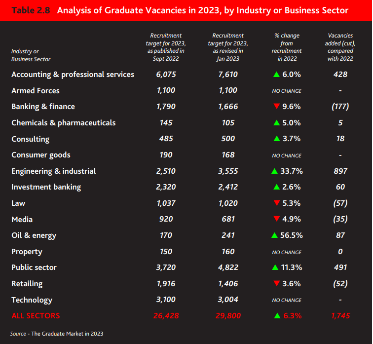 在2023年,前100名最佳雇主中,有3/5的雇主计划招聘更多毕业生。2023年 预计 7个行业 (下图) 会招收更多毕业生,其中 工程 (+897)、 公共部门 (+491)、 会计 (+428) 类企业 的毕业生需求缺口很大 , 招聘数量会有大规模增长!