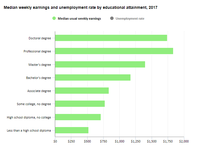 据美国劳工统计局2017年的数据显示, 拥有博士学位的人比只有硕士或学士学位的人收入更高。