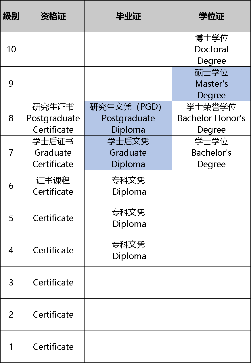上表中蓝色部分学士后(GD)和研究生文凭(PGD)分别属于7级和8级的毕业证课程(Diploma),读完以后只有毕业证书没有学位证书;硕士(Master)属于9级学位课程(Degree),读完以后有硕士学位。
