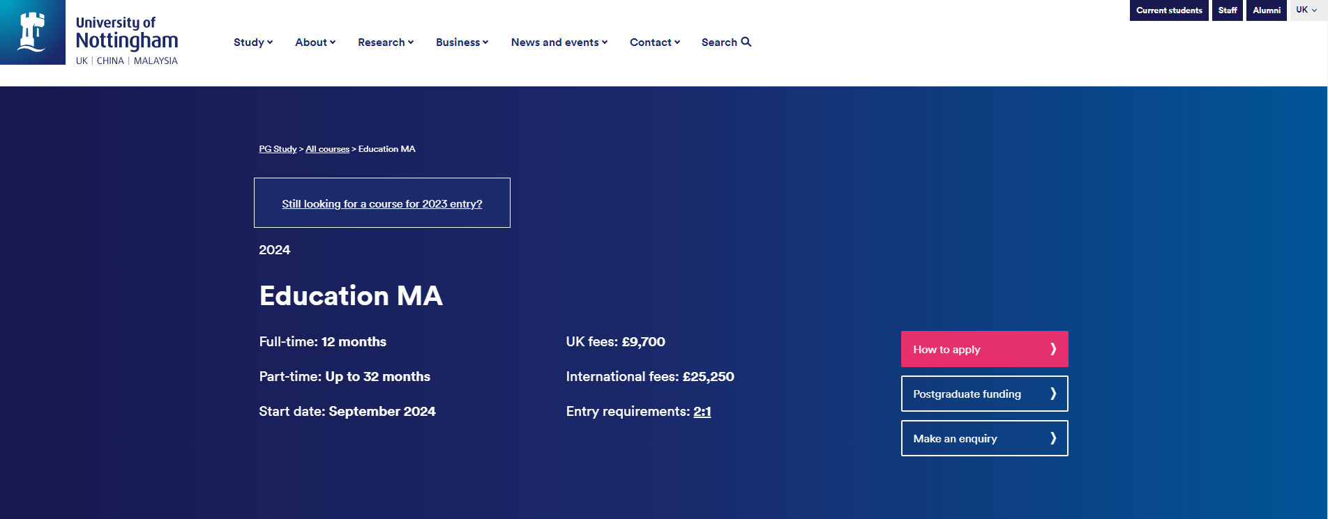 去年诺丁汉大学在7月开放申请,今年直接提前到了6月,官网上的课程信息已经更新为24年的了。
