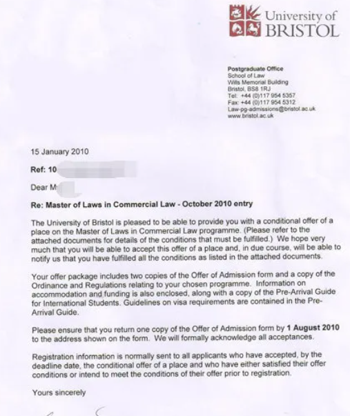 Offer,英文是邀请的意思,就是录取通知书,全称是Offer Letter,汉语解释为录用信、录取通知,除了可以用在大学录取以外,也可以用在企业单位等地方,比如某个企业录取你以后,就会发放一份Offer给你,以表示你被企业录取了,英国大学的Offer一般分为两种,一个是有条件录取通知书(Conditional Offer),另一种是正式录取通知书,也叫无条件录取通知书(Unconditional Offer),只有拿到了英国大学给你发的Offer后,按照Offer上面的要求,才可以换取大学的CAS(也就是确认电子录取通知书),大学发放的Offer一般是邮件电子版的,如下图,是英国布里斯托大学的Offer。