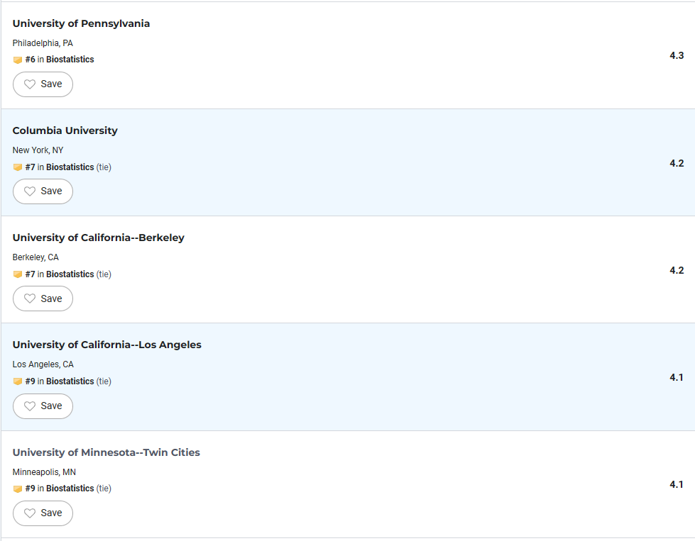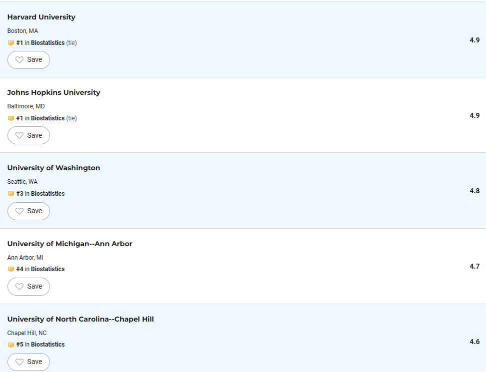 JHU的生物统 计专业设在其公共卫生学院下,JHU 的布隆伯格公共卫生学院排名第一, 研究领域横跨基础科学、医学和公共卫生。