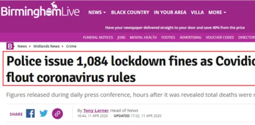 截止英国时间4月11日,英国警方已对违反禁令的市民开出了1084张罚单。