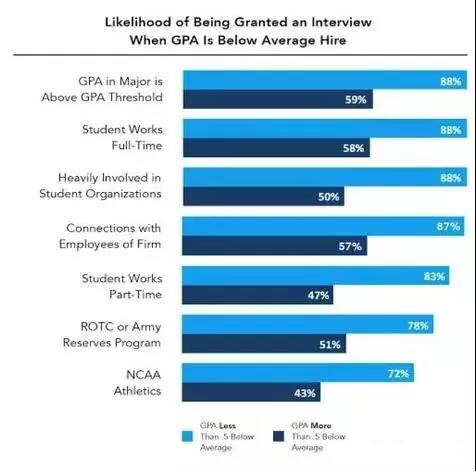所以,GPA是你进入面试的敲门砖,然而进门后这块砖价值便会骤跌。公司在用GPA作为最重要的门槛决定是否给予面试机会后,后续则完全不会将GPA作为一个重要考量因素,反而会强调其他方面的表现。一旦获得面试机会,那些在课外活动、实习经历和社交方面投入更多的学生并不难获得最终录用机会。