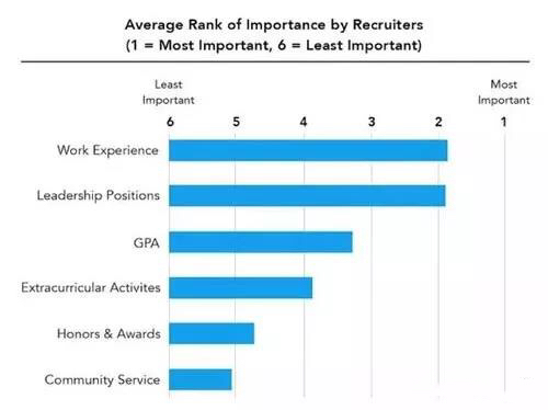 重要性降序排列,依次为 工作经验、领导力、GPA、课外活动、荣誉与奖励、社区活动。