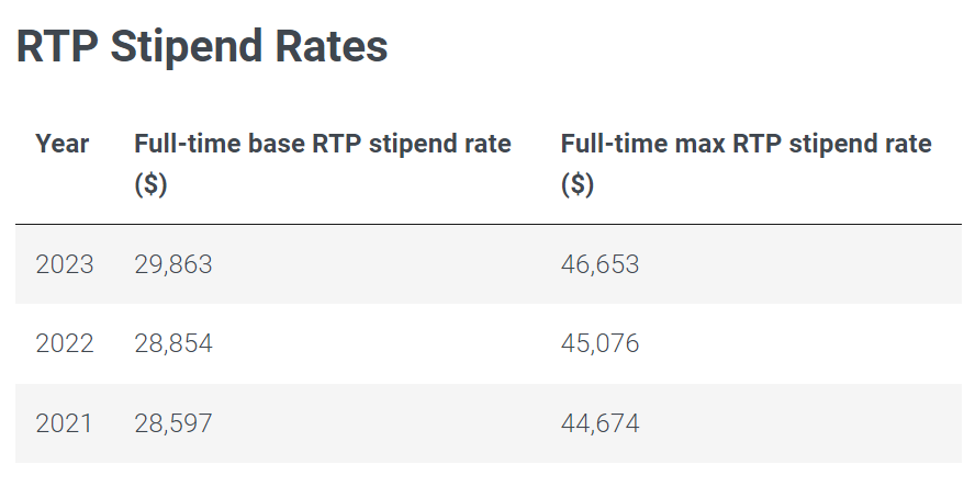 该奖学金为研究型硕士学位提供最多 2 年的奖学金,为研究型博士学位提供最多 4 年的奖学金。根据澳洲政府官网给出的数据,2023 年补助金额在 29,863-46,653 澳元之间,澳洲政府每年会依据 CPI 指数进行调整。