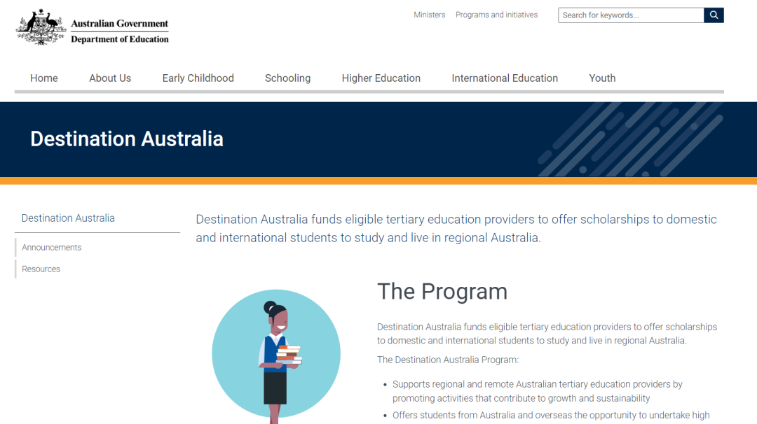 接下来是学校奖学金,澳洲众多高校都为学生提供丰厚的奖学金,在申请学校时大家可以前往各校官网进行查看,通常在 Scholarships 或相关版块下可以找到详细信息。大家也可以到澳洲政府教育部官网查询全澳洲学校的所有奖学金项目: