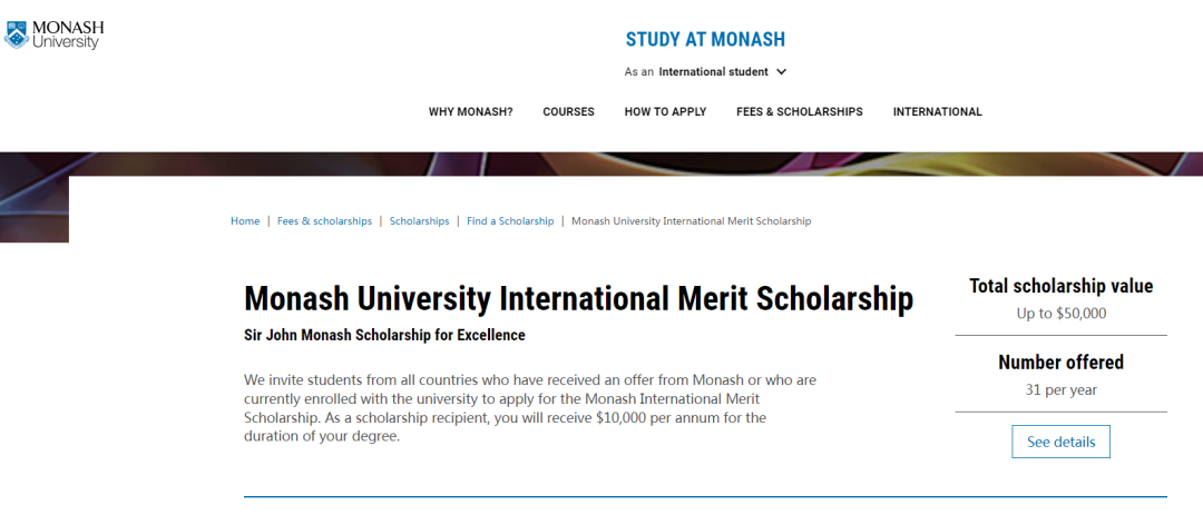 比如莫纳什大学向来自全球各国的国际学生提供了国际优异奖学金,奖学金获得者可以在学习期间每年获得 10,000 澳元,最高 50,000 澳元的奖金补助。