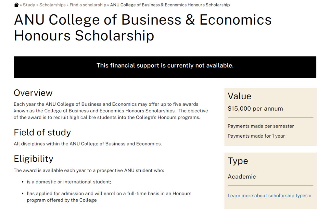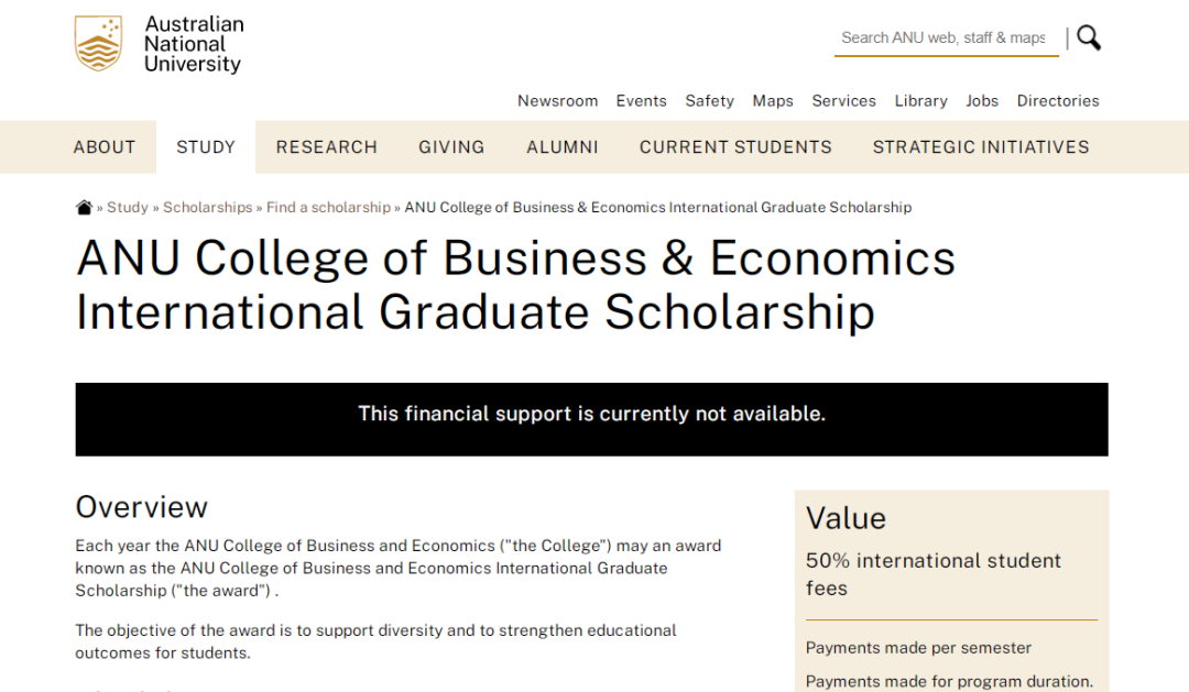 比如澳洲国立大学商业与经济学院提供了国际研究生奖学金,获得该奖学金的国际学生可以减免 50% 的学费;另外,该学院还为所有就读荣誉课程的学生提供了每年15,000 澳元的荣誉奖学金。