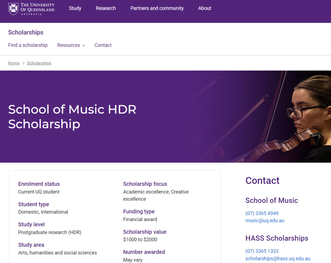 再比如昆士兰大学音乐学院为就读研究型研究生学位的学生提供了 1,000-2,000 澳元的奖学金。