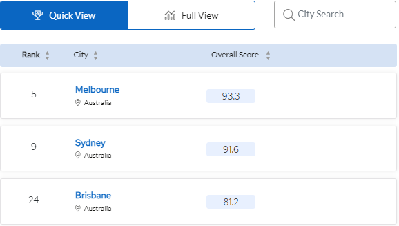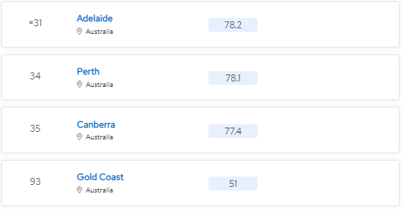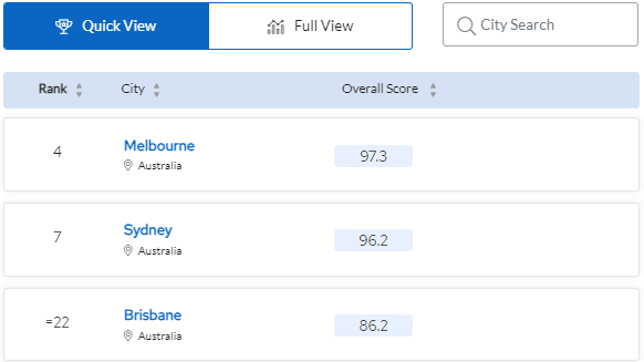 不仅是世界大学排名,在前几天发布的QS最佳留学城市排名中,澳大利亚也表现出色! 我们就一起对比着看看,去年澳大利亚有7座城市上榜,其中墨尔本排名总榜单第5,悉尼则排在总榜单第9。具体表现如下: