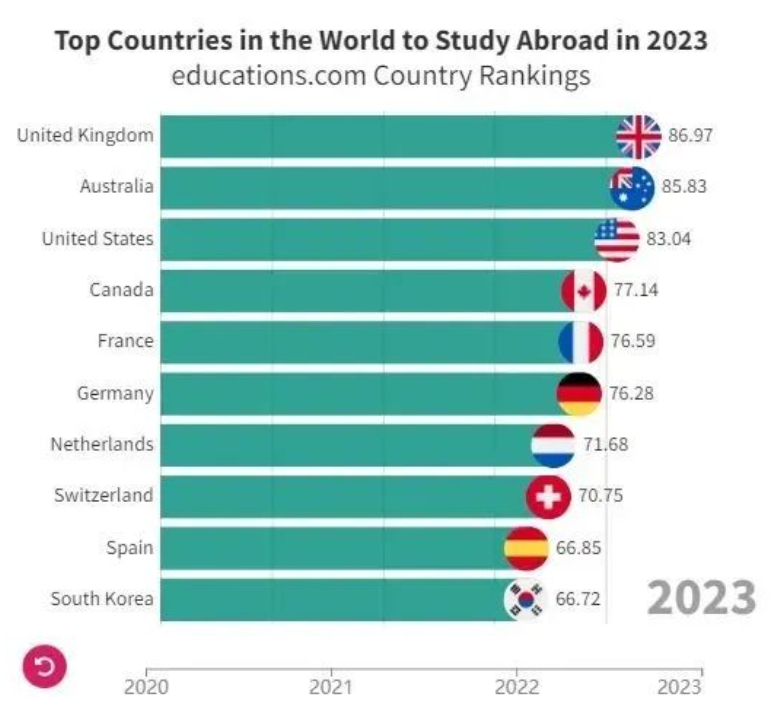 这还没完!在一份最佳留学国家的名单上,澳大利亚排名总榜单第二位,前五名分别为:英国、澳大利亚、美国、加拿大、法国 。就说人家澳洲排名硬不硬?!排名够硬,怎能不让申请者开心!