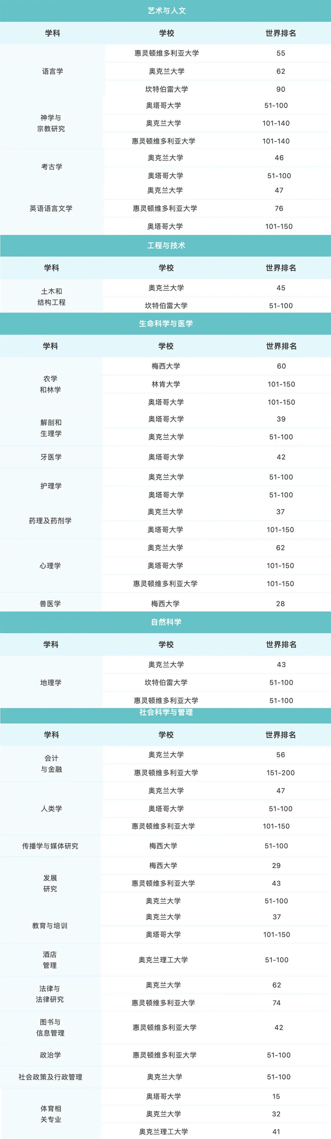 2023QS世界大学学科排名中, 新西兰的各个大学在其中16个学科的排名中位列全球TOP 50,在24个学科中的排名位列全球TOP100 ,下面的图是排名情况总览: