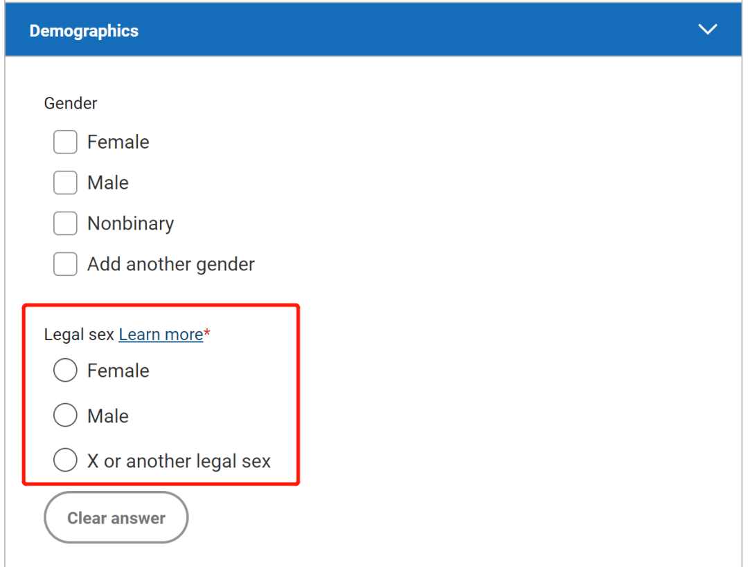 在 Legal Sex部分,增加了 “X or another legal sex” 这一选项,而不再局限于 “Male” 和 “Female”。第三性别的选项给予了申请者更大的包容,也是美本申请多样性的一个体现。