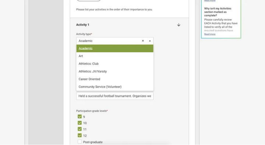 而在下方列举活动的部分,学生要选择活动的 Activity type(活动种类),这里可以看到有更多不同课外活动的项目,一共有多达29种!