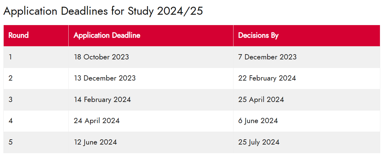 2024申请季,爱丁堡大学商学院依然采取分轮录取,共分 五轮 ,并设定了一系列 申请截止日期 (Application Deadline),第一轮截止日期 2023年10月18日 ,距离现在 仅剩50天 。