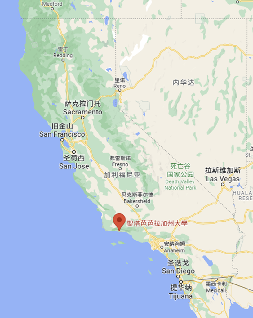 Location: Santa Barbara, CA 93106。 位于加州西部,南部,沿海(就在海边上)。于 UCLA 北部。距离洛杉矶市中心 105 英里( 170 公里)