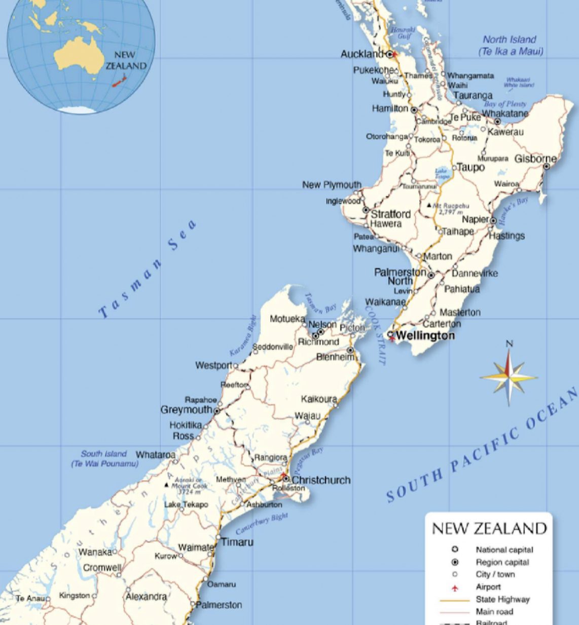 其国土主要由两大岛屿组成,即北岛(Te Ika-a-Māui)和南岛(Te Waipounamu),两岛以库克海峡分隔,首都惠灵顿位于北岛南端,首都辖境还包含了一些小岛。