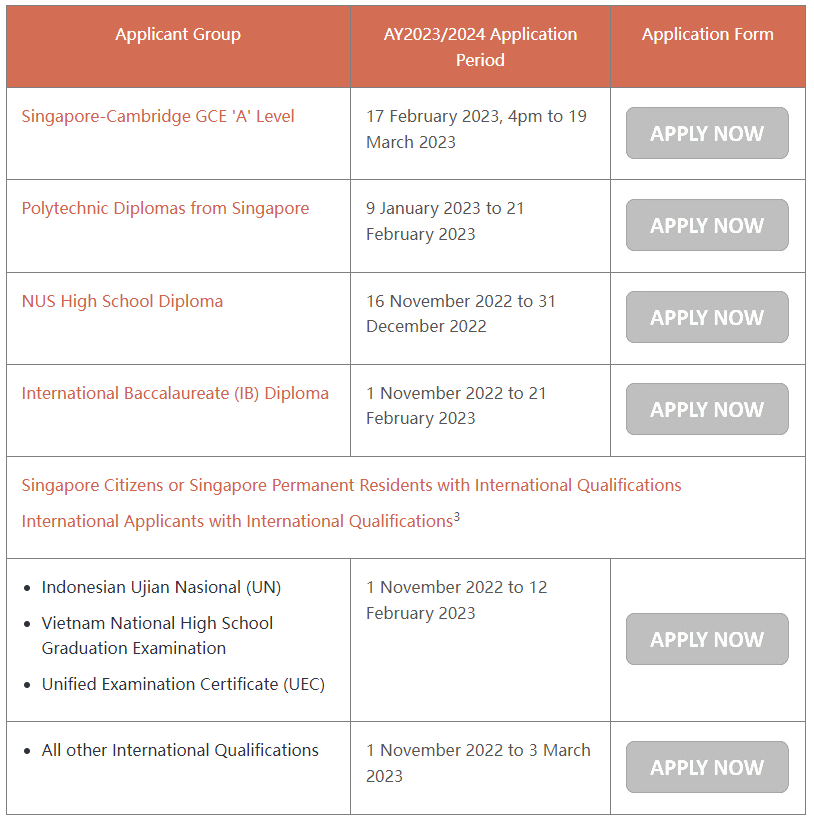 ● 申请重要日期: 该校尚未公布2024-2025申请日期 。 新加坡国立大学不同课程的申请截止日期也不相同。以2023至2024申请季来看,关键时间点为: