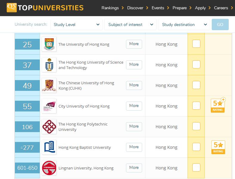 香港地区共有七所大学进入了QS世界大学排行榜(相比同级排名,内地则有31所大学(世界排名第650名以前)。内地总共有40所大学进入QS世界排名的榜单)