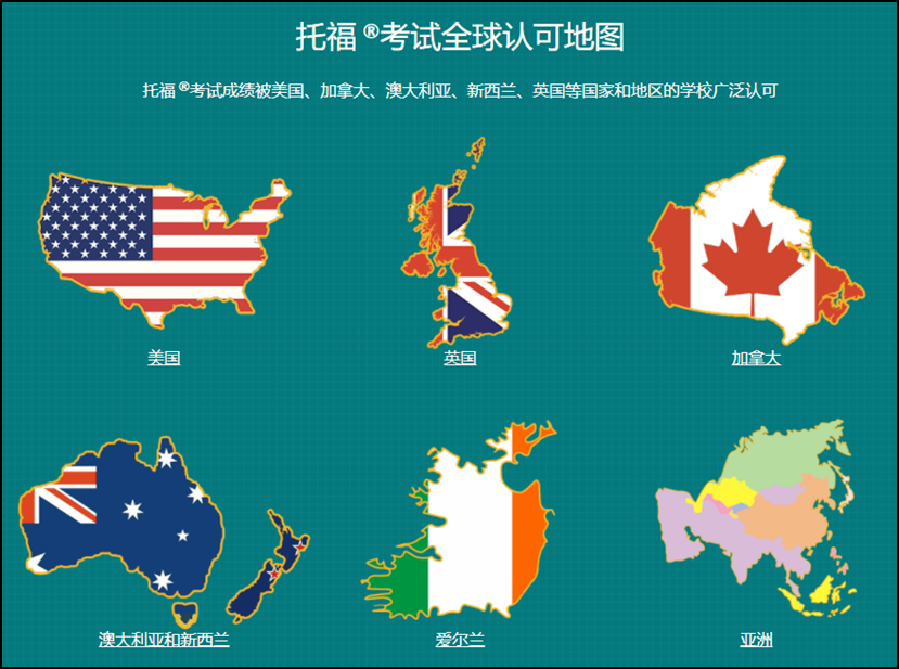 托福是由美国教育考试服务中心(ETS)举办的英语能力考试,因其科学严谨的考试内容而被全球几乎所有高校接受认可,范围包括澳洲、新西兰、加拿大、美国,以及整个欧洲和亚洲。