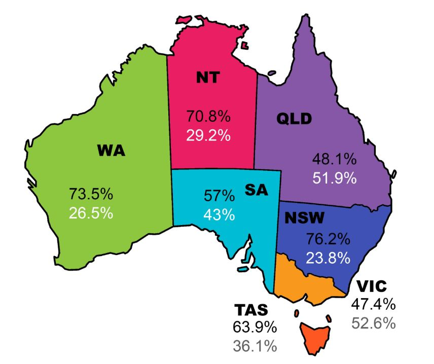 下面是澳洲各个州的TAFE占比与非TAFE占比,黑色的是TAFE比例,白色、灰色是非TAFE比例。可以看到除了维州和昆州,其他州都是TAFE课程多。因此TAFE在澳洲教育上,还是很重要的一部分。