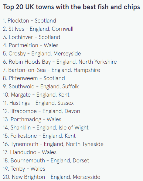 除了上面那家网红店,国际旅游评论网站TripAdvisor也评选出了英国TOP20的炸鱼薯条店,评选依据的是系统检索数量。