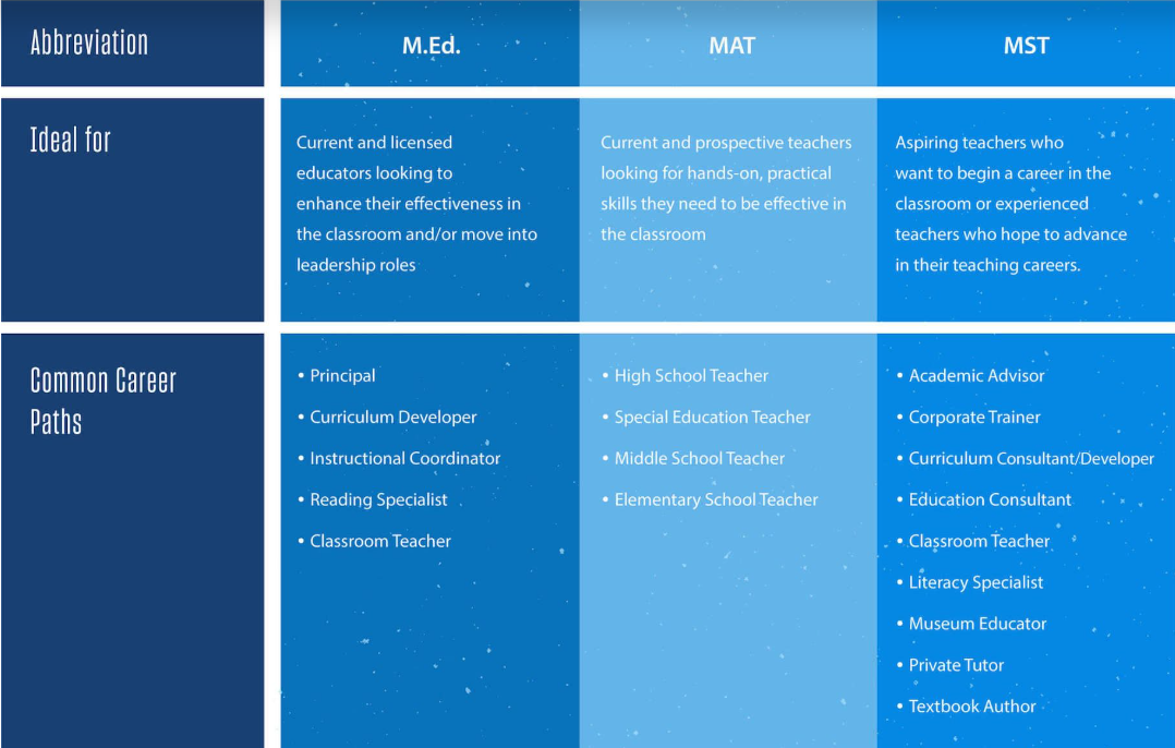 每个学位课程因学院或大学而异,但许多课程遵循类似的课程和毕业要求。与MST相比,大多数M.Ed.和MAT课程需要更多的实践经验和更少的研究,但情况并非总是如此。一所学院或大学的M.Ed.课程可能有 STEM 专业,而在另一所学院或大学,STEM 专业可能属于 MST。