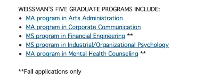 巴鲁克学院有三个分院: 杰克林商学院,威斯曼艺术和科学学院以及公共事务学院。我们今天讨论的金融工程硕士(MS program in Financial Engineering,以下简称MFE) 项目就开设在威斯曼艺术和科学学院Weissman School of Arts and Sciences (注意: 并非在杰克林商学院,很多平台的文章都是错误的,请各位朋友仔细辨别)。截至目前,威斯曼艺术和科学学院仅开设5个小而精悍的研究生项目,分别是: Master of Arts的艺术管理和企业传播: Master of Sciences的金融工程、组织心理学和心理健康咨询。其中MFE与心理健康咨询仅接受秋季申请。