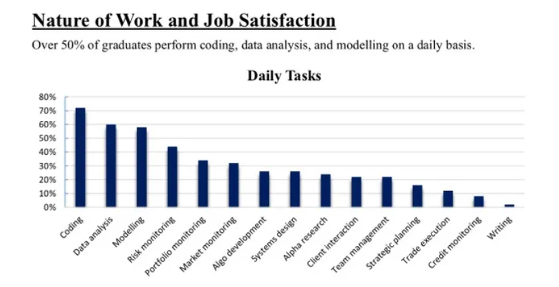 这份报告最终统计数据并不大,因为该专业每年也就毕业30人左右。通过报告我们可以看出,从在工作性质上来说,超过50%的毕业生每天从事编程、数据分析和建模工作(金融工程专业出来的人不愧被称为“金融界的码农”)。其他工作内容也包括了,风险/市场/信用监测、算法开发、系统设计、阿尔法研究、客户端交互、团队管理、战略规划、交易执行等等。