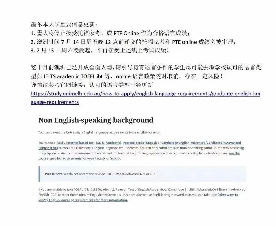 即刻起,墨大不再接受任何online形式的语言考试成绩来满足语言要求; 墨大将停止接受TOEFL iBT at Home托福家考、或PTE Online作为合格语言成绩; 墨尔本时间7月14日周五晚11:55前(北京时间7月14日周五晚9:55前) 递交的托福家考和PTE online成绩会被审理;之后将不再接受任何线上考试成绩。