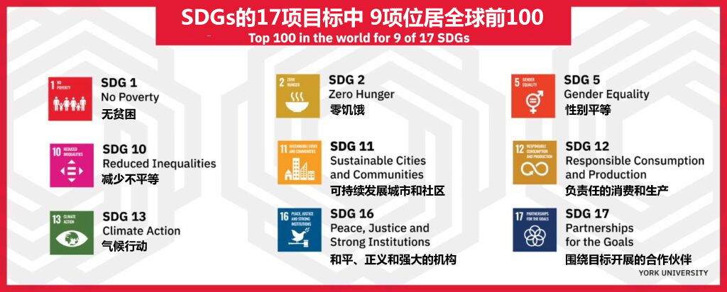 约克大学在17项联合国可持续发展目标(SDGs)中,有9项位居全球前100,并在以下领域中脱颖而出,展现出其不可撼动的全球地位: