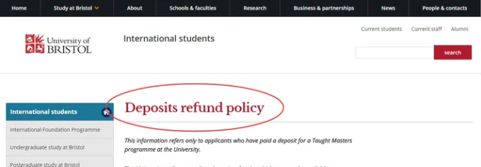 雅思分数没达到直录的情况:如果你12月份交了布里斯托留位费,然后1,2月份来了UCL的offer,你发信给布里斯托大学,说雅思考不出来,又不想读语言,要求退还押金,学校的Deposit Refunds Team百分之百会拒绝你。为什么呢?
