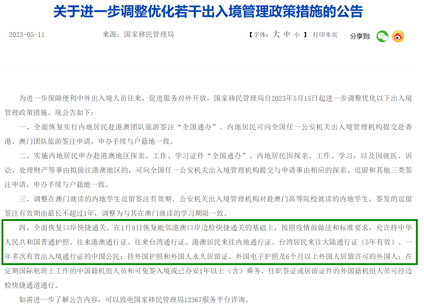 中国国家移民管理局前不久发布公告,自2023年5月15日起进一步调整优化出入境管理政策措施,包括将全面恢复口岸快捷通关。持中华人民共和国普通护照、持外国护照和外国人永久居留证、外国电子护照及6个月以上外国人居留许可的外国人都可以经由快捷通道入关。回国入关更加方便了!
