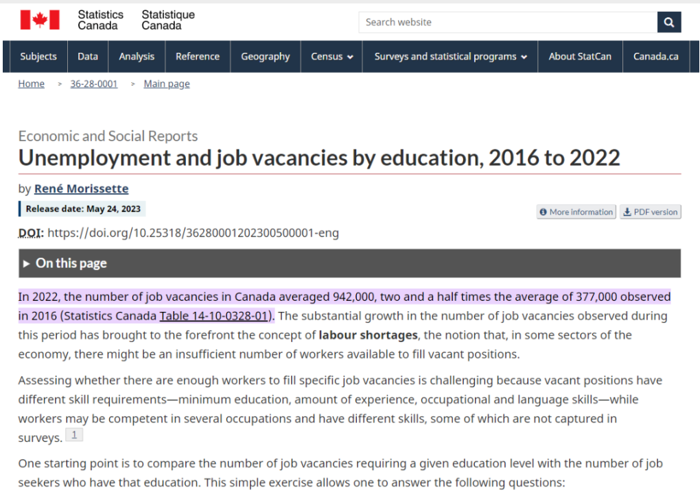 一直以来,大家的印象就是加拿大劳动力短缺,尤其是疫情以后,不断上涨的工资压力、新低的失业率及季节性的职位空缺更加深了大家的这一观点。但是近日加拿大统计的一份报告给出了更多的细节,让我们一探究竟。