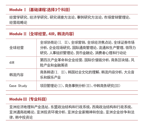 庆熙大学经营大学院亚洲经营中文MBA是为培养对韩中两国未来指向性发展做出贡献的全球人才和韩国顶级国际经营专家而开设的专业教育课程。随着全球化程度加深,学习与亚洲地区经营相关的各方面知识和实用性信息变得日益重要,对于需要细分研究的领域,根据教育特性集中提供系统化,个性化的教育环境。特别是为了解决在世界经济中脱颖而出的亚洲区域的物流和投资相关发生的各种商业问题。