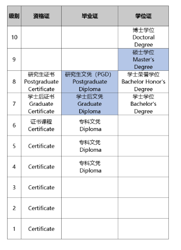 在新西兰读书,同一个级别包含了资格证(Certificate),毕业证(Diploma)和学位证(Degree)三种文凭。 上表中蓝色部分学士后(GD)和研究生文凭(PGD)分别属于7级和8级的毕业证课程(Diploma),读完以后只有毕业证书没有学位证书;硕士(Master)属于9级学位课程(Degree),读完以后有硕士学位。