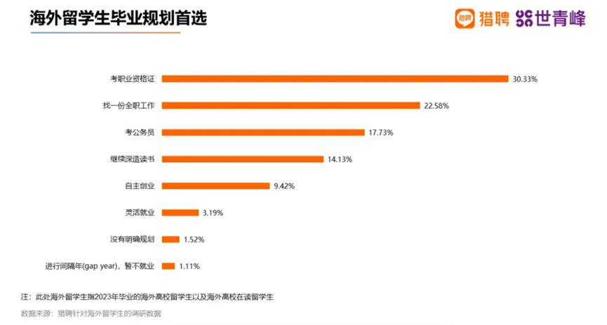 根据猎聘针对海外留学生的调研数据显示, 30.33% 的海外留学生毕业后的首选是考取职业资格证 ,22.5%的留学生希望能找到一份全职工作 ,17.73%的留学生毕业首选是考公务员 ,还有14.13%的毕业生想要继续深造读书 。
