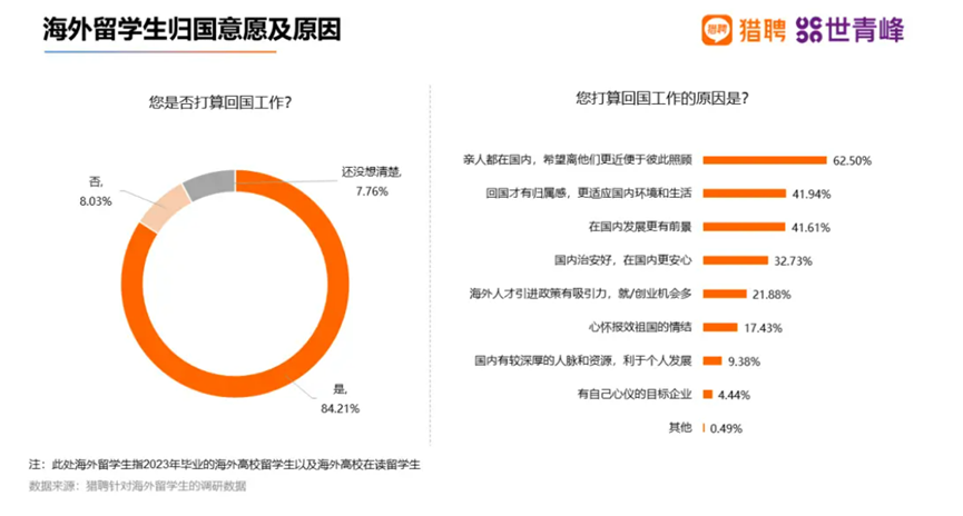在毕业后首选找全职工作的海外留学生中,有 84.21%的人打算回国就业 ,其排名前三的原因是回国与亲人相互照应 、回国有归属感 、在国内更有发展前景 ,这三项得票率分别为62.5%、41.94%、41.61%。