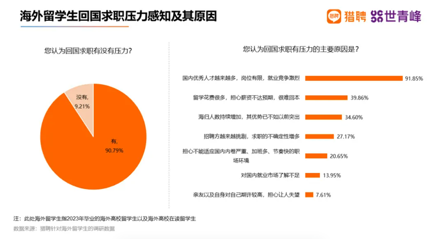 然而,在打算回国就业的海外留学生中,90.79%的人表示他们回国求职有压力 ,背后最重要的原因是“ 国内优秀人才越来越多 ,岗位有限,就业竞争激烈”“留学花费很多,担心 薪资不达预期 ,很难回本”“海归人数持续增加,其 优势已不如以前突出 ”,得票率分别为 91.85%、39.86%、34.6%。