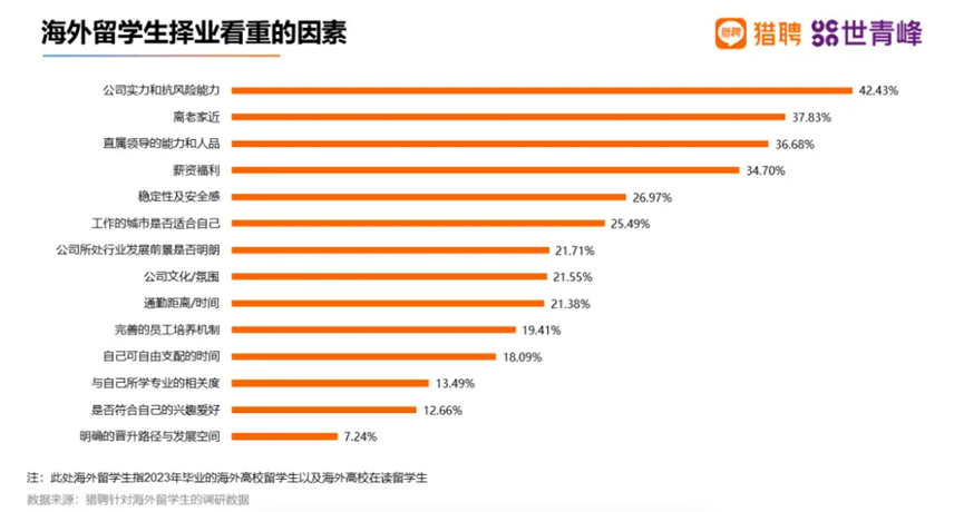 42.43%的海外留学生择业最看重的因素是公司实力和抗风险能力 ,得票率位居第一;“ 离老家近 ”“ 直属领导的能力和人品 ”“ 薪资福利 ”位居第二至第四,占比为 37.83%、36.68%、34.7%。