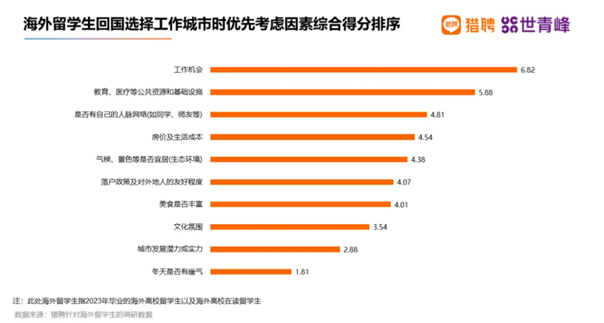 对于回国工作城市的选择方面,留学生优先考虑从的是第一因素是工作机会 ,得分为 6.82;其次是“ 教育 、 医疗等公共资源和基础设施 ”,得分为 5.88。