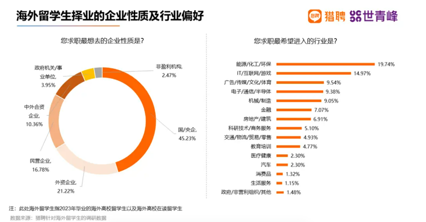 本次调研显示,45.23%的海外留学生求职最想去 国 / 央企 ,排名第一;想去外企和民企 的人占比 21.22%、16.78%,位居第二、第三。 当问及求职最希望进入的行业,选择的 能源 / 化工 / 环 保 、 IT / 互联网 / 游戏 的人数比例最高,分别为19.74%、14.97%。