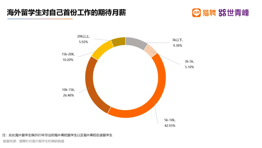 当问及第一份工作的期待月薪 ,42.93%留学生表示为5千-1万 ;26.48%表示为 1万-1.5 万 。