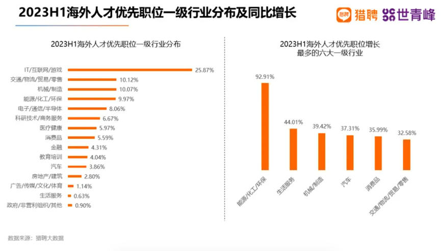 从2023上半年海外人才优先的职位一级业分布来看, IT / 互联网 / 游戏 遥遥领先,占比为25.87%;