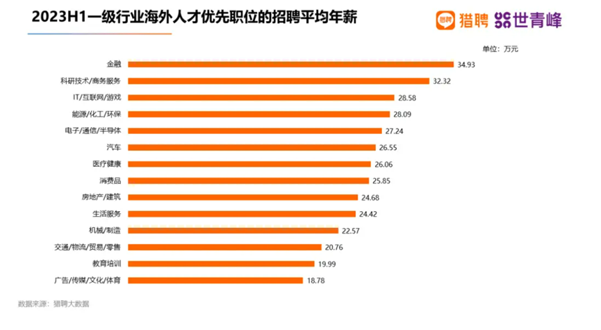 从上半年海外人才优先职位的招聘平均年薪来看,各大一级行业招聘平均年薪均高于18万 。