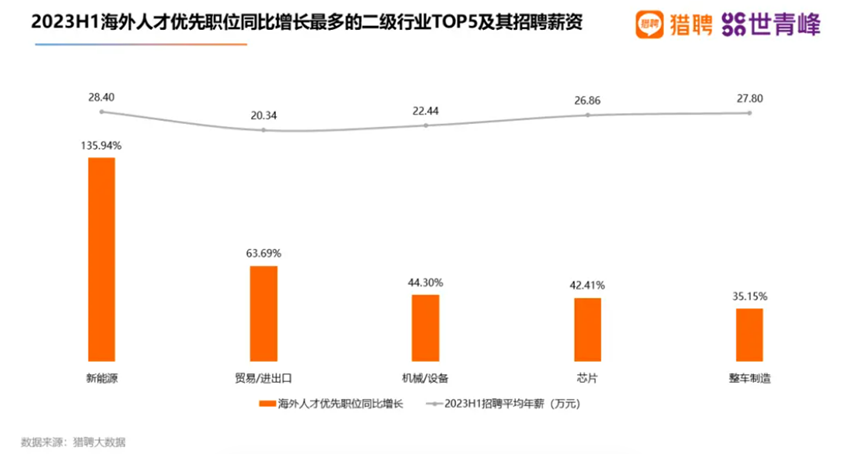 从上半年二级行业的海外人才优先职位同比增长来看,新能源行业海外人才优先职位增长最高 ,为 135.94%;
