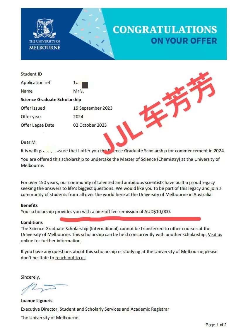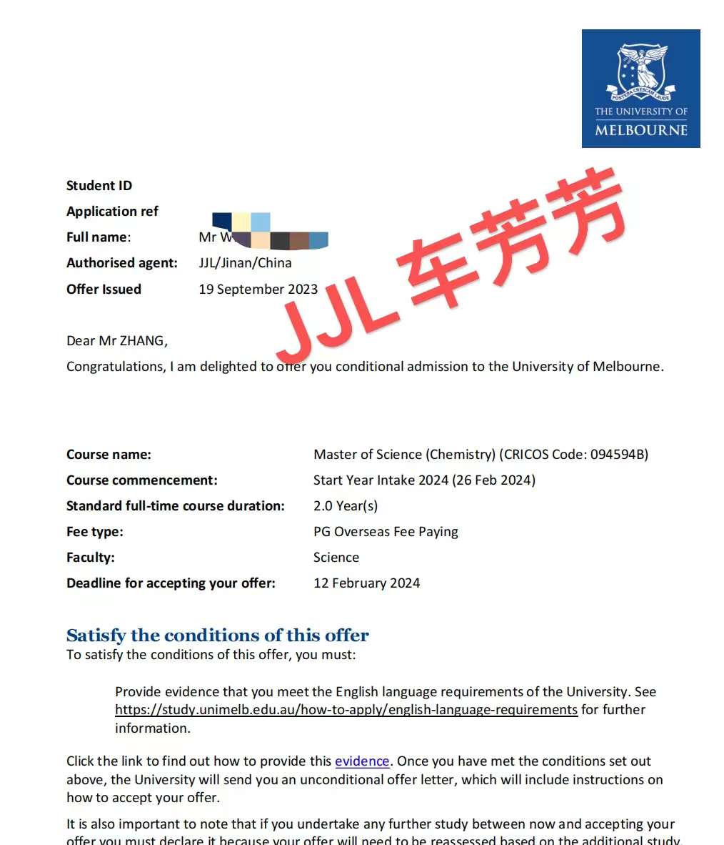 昨日收到了墨尔本大学master of science (Chemistry)24年2月的offer。太为学生高兴了。